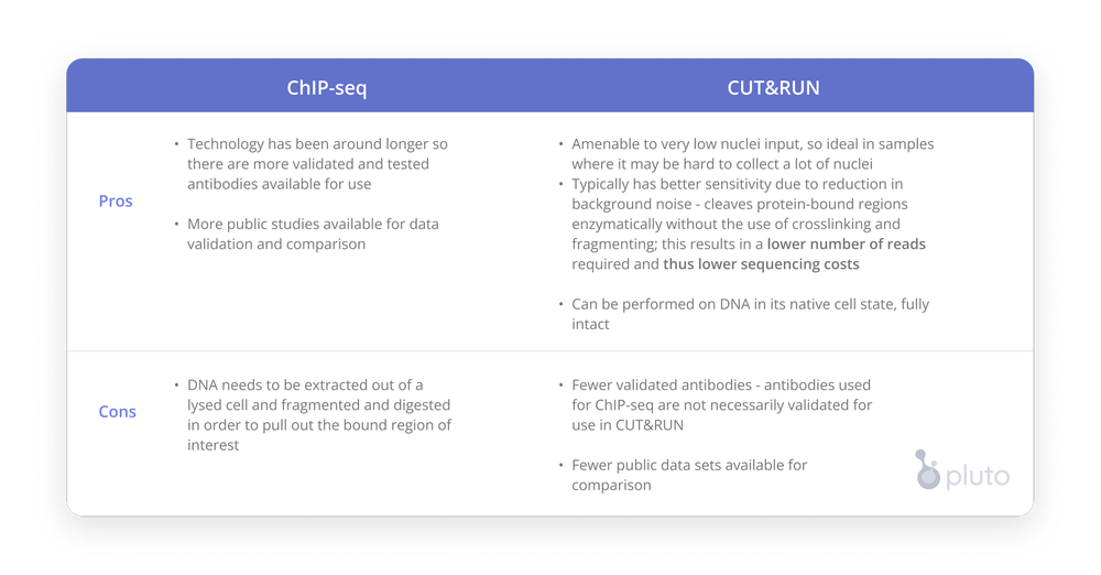 Although all methods measure protein-DNA interactions with the use of an antibody, there are some key pros and cons to consider when selecting an assay to test your hypothesis.