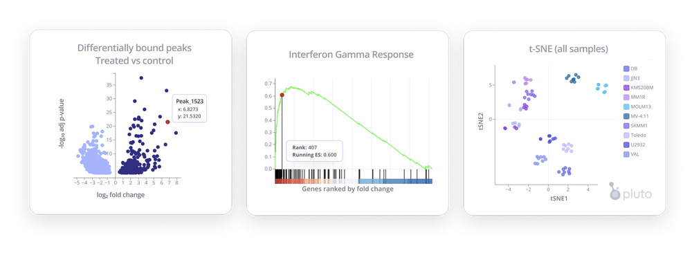 Create all of these plots (and more!) in Pluto. Contact us to get started running bioinformatics analyses to create the interactive plots shown in this blog, all from your browser.