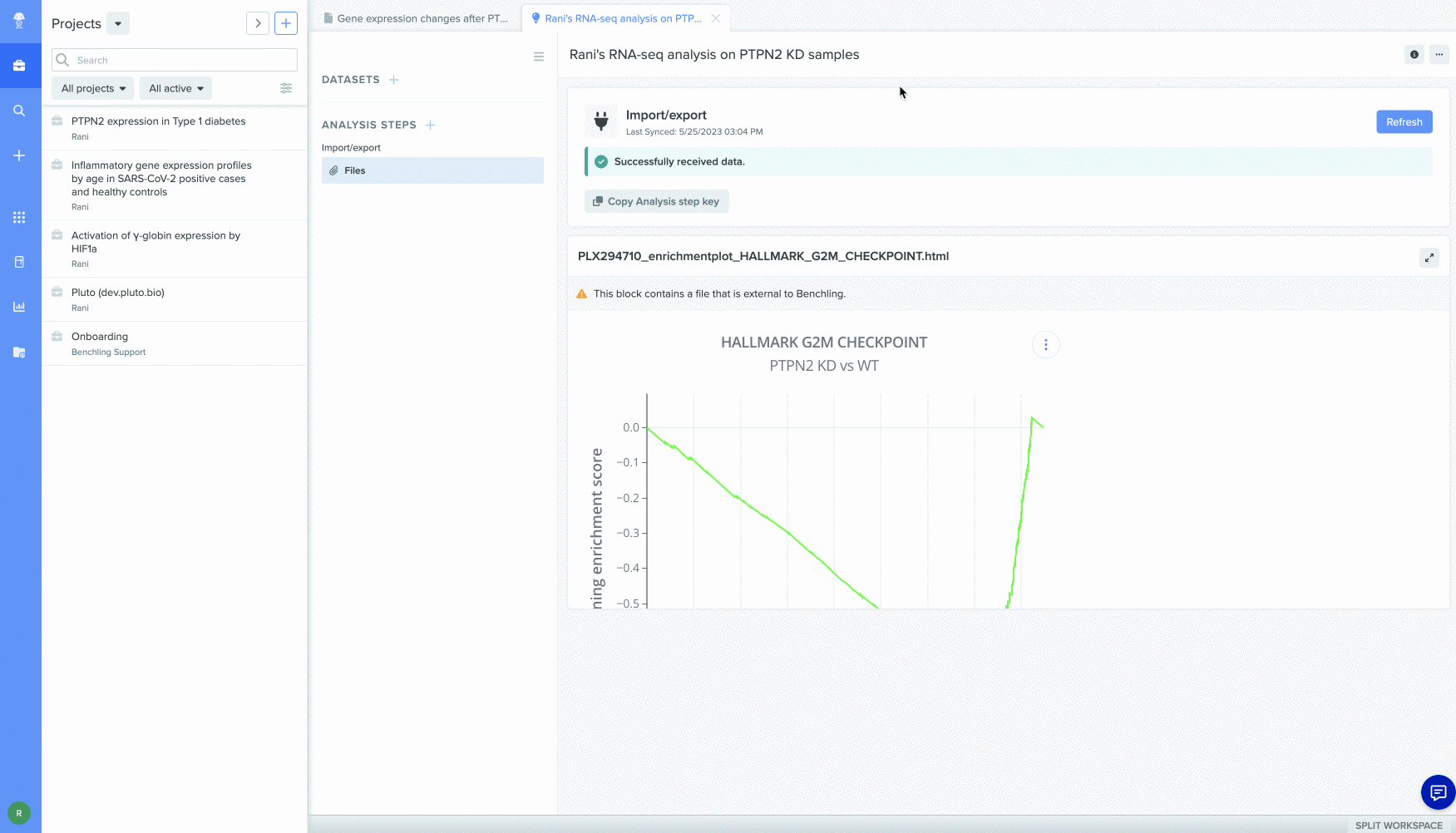 While analyzing large, biological data sets and create publication-ready plots in Pluto, you can sync your results to Benchling for other members of the team to view. Features include: