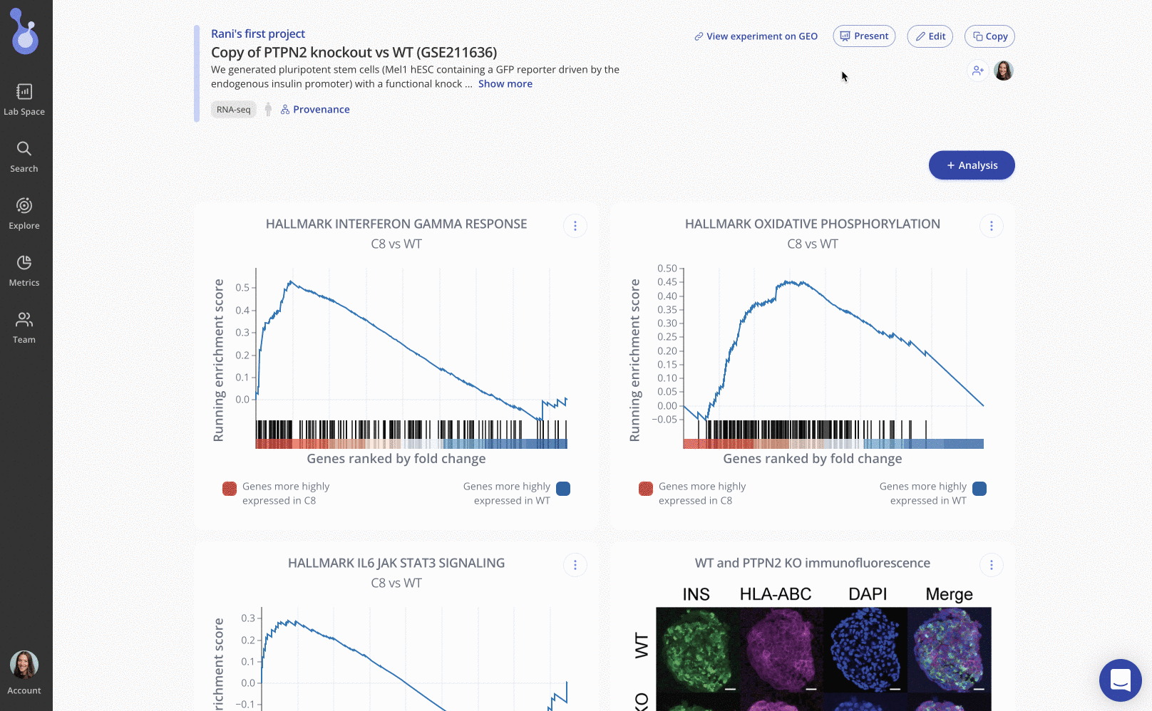 Generate new preliminary data or supporting results in minutes! Visit Pluto's library of 14,000+ published experiments, make a copy with one click, and start performing and saving your own analyses.
