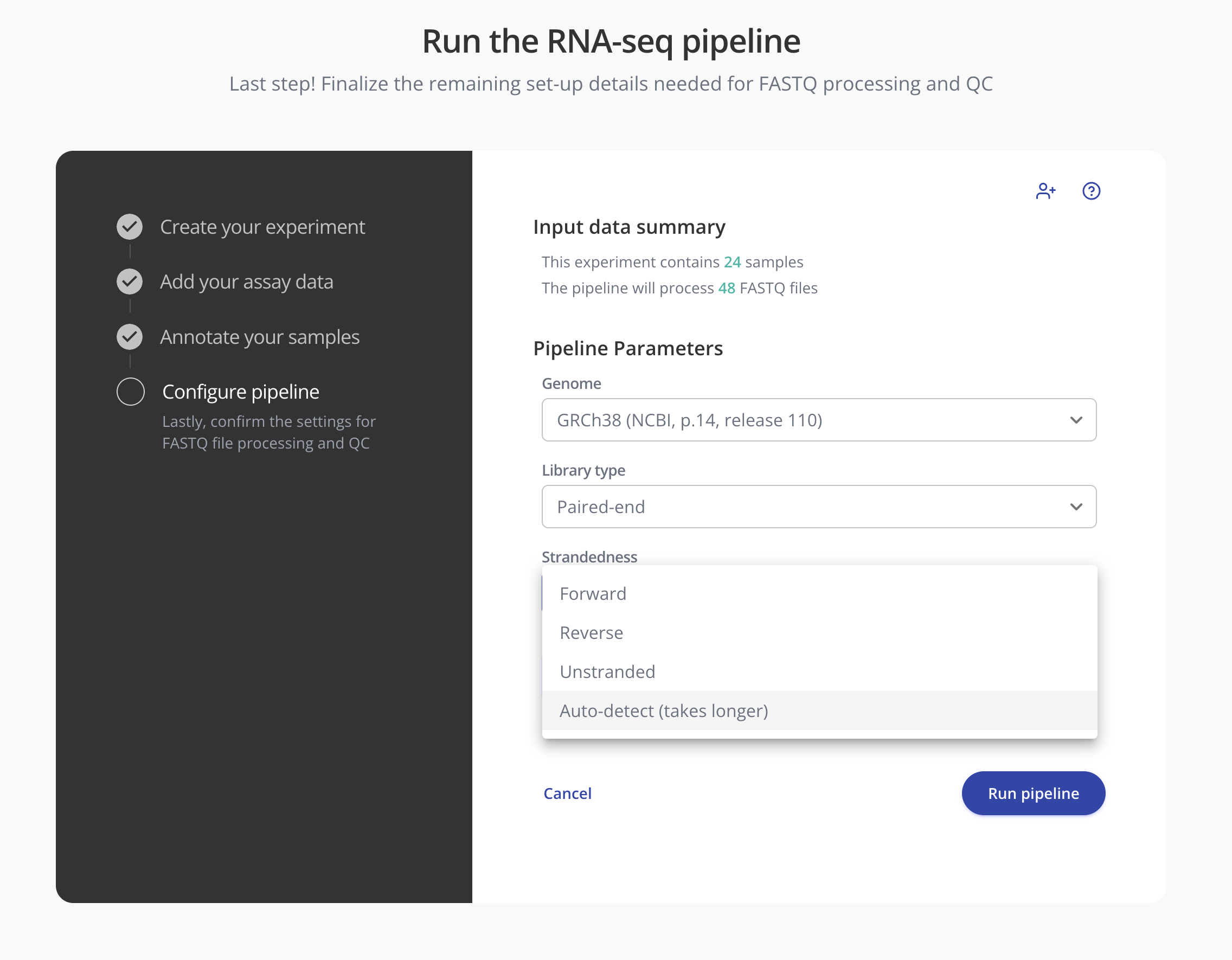 Not quite sure whether your RNA-seq data was forward, reverse, or unstranded? Select the new "Auto-detect" option and the pipeline will automatically handle the QC and counting accordingly.