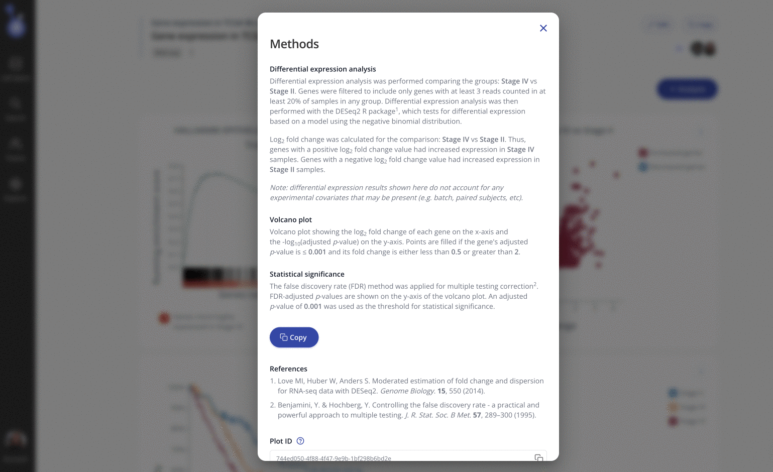 Track your analysis and plot parameters with zero effort. Pluto plots write their own dynamic "methods section", which can be copied in one click, references and all. Methods are even available on embedded Pluto plots, allowing your results (and whole team) to stay in-sync and always know how results were generated.