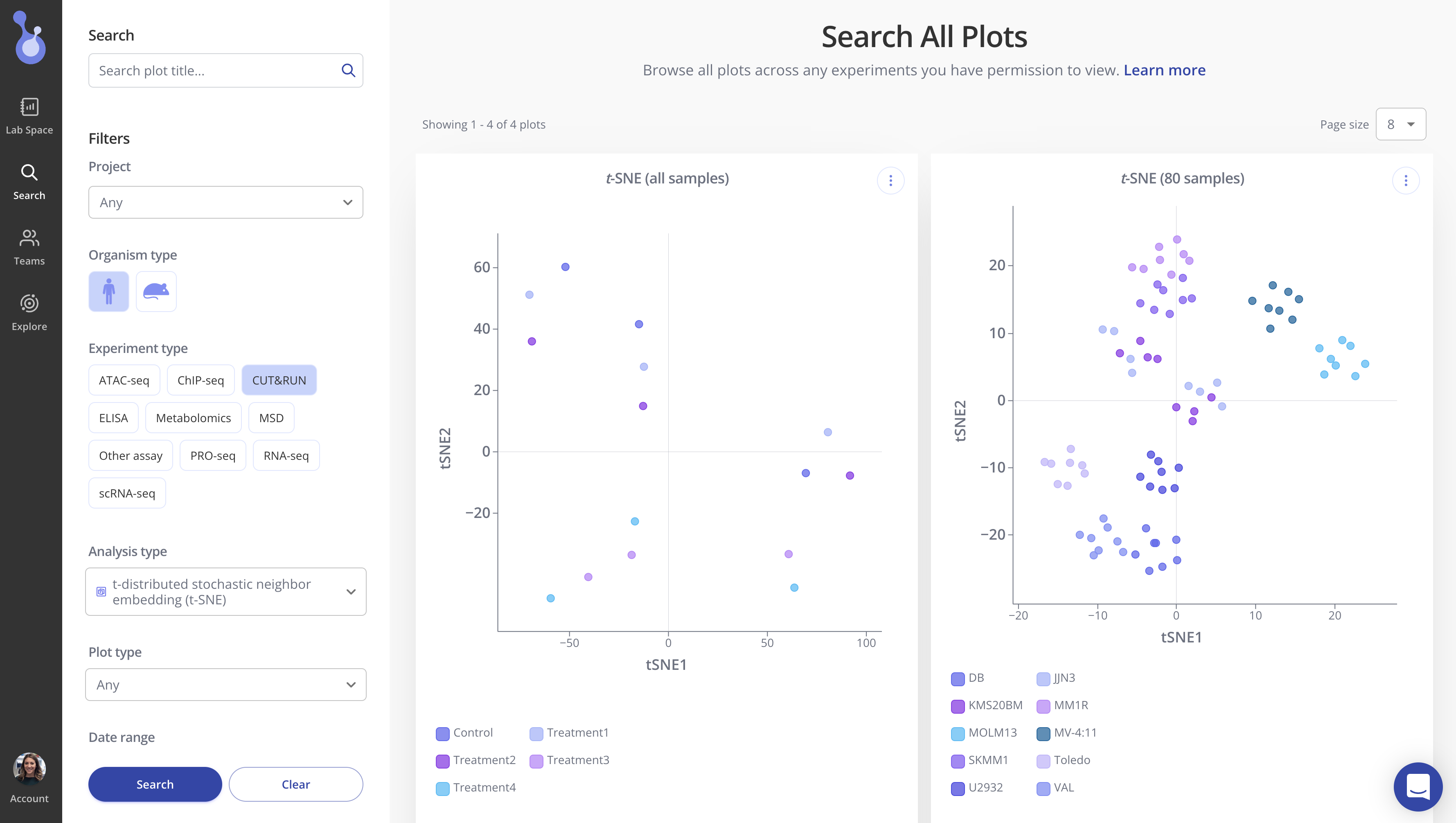 You can now see all your plots side-by-side and compare their results. Filter by project, organism, experiment, analysis, date, and plot type.