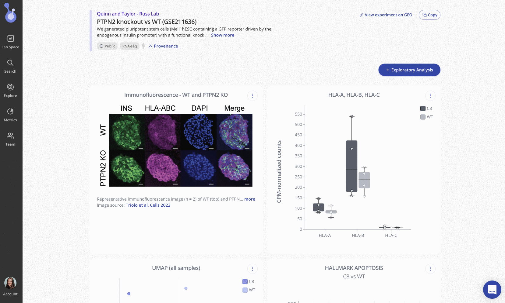 Using Pluto’s intuitive, web-based interface, Russ Lab members Taylor Triolo and Quinn Matuschek uploaded their bulk RNA-seq data to Pluto in FASTQ format for processing via Pluto’s automated RNA-seq pipeline. After pre-processing, alignment, and quality control, Taylor and Quinn performed differential expression analysis to identify 308 differentially expressed genes in the PTPN2 knockout line compared to WT control samples.