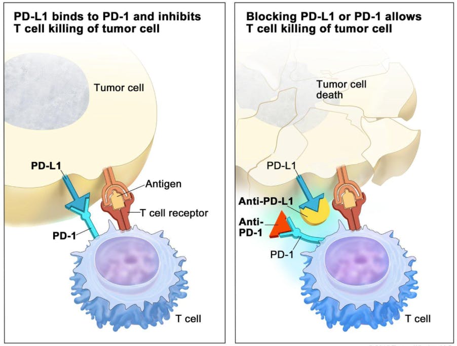 Interaction between PD-1 and PD-L1 results in immune evasion. Blocking antibodies disrupt this interaction allowing tumor cell death to occur. Source: National Cancer Institute.