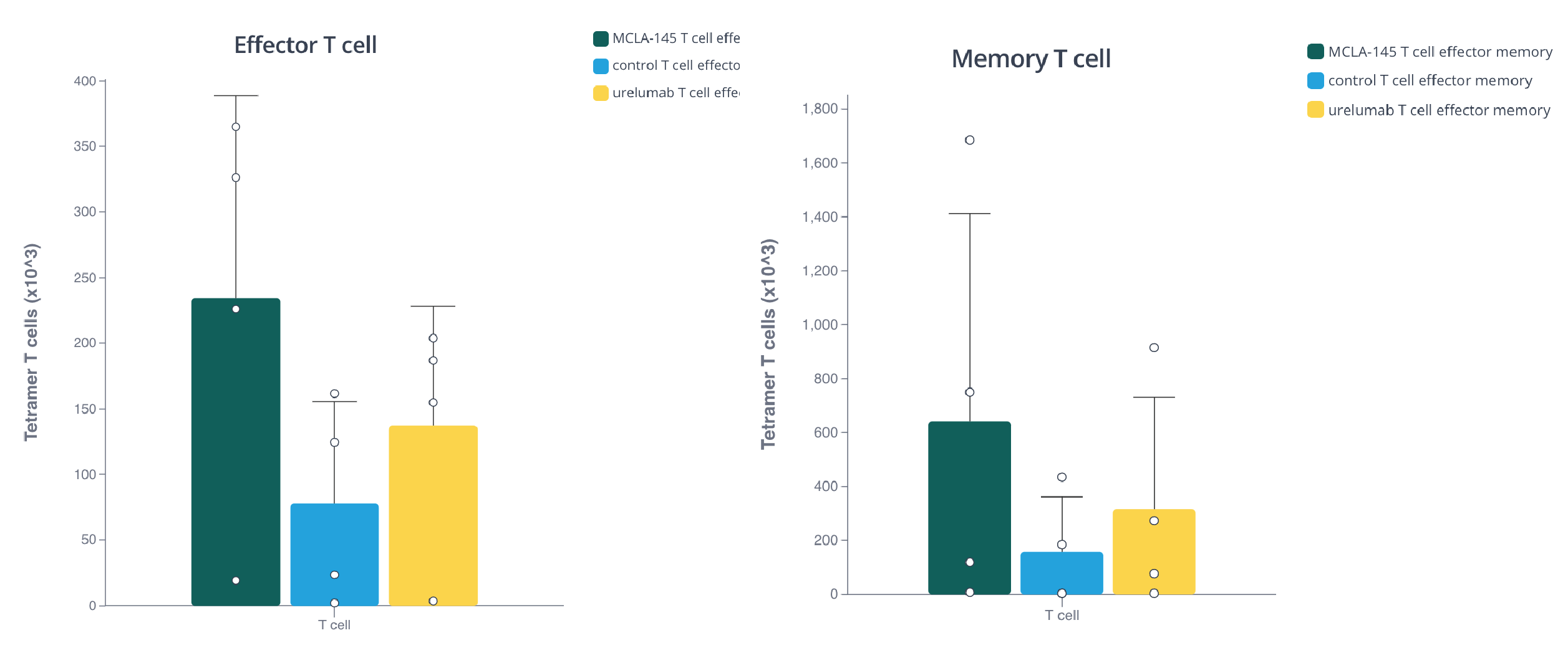 Barplot showing the effect of MCLA-145 on effector and memory T cell priming from 4 donors. Plot made with Pluto.