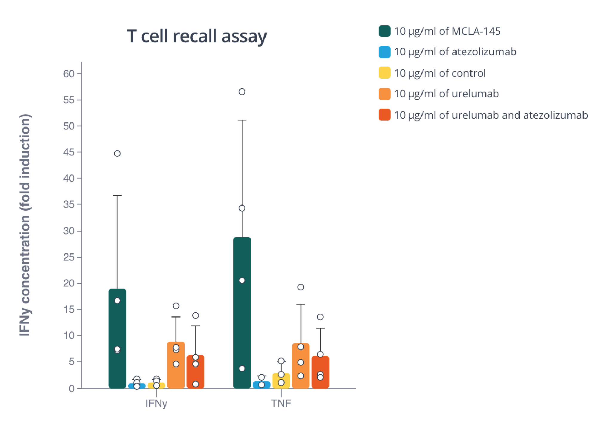 Memory T cells are potently activated by MCLA-145 as seen by the high cytokine levels. Barplot made with Pluto.