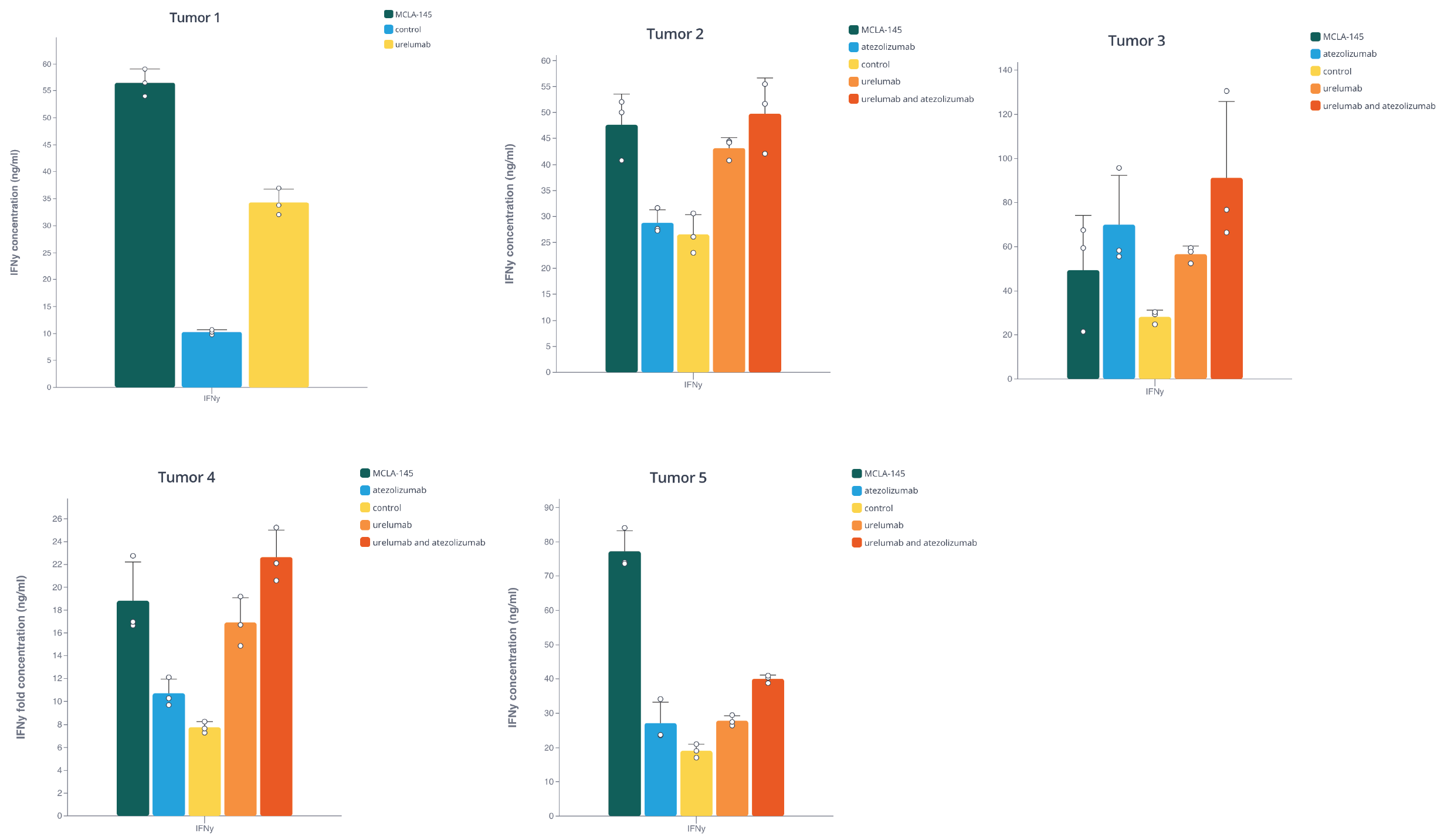 MCLA-145 induced IFNγ expression above the control levels in 5 primary tumor samples. Barplots made with Pluto.