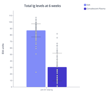 The rest of the volunteers without a prior COVID infection developed varying levels of anti-S1 antibodies after the 1st dose (3 weeks). However, six weeks after the first dose (three weeks after the second dose) all participants elicited high levels of anti-S1 antibodies and their levels were significantly higher than the anti-S1 levels detected in the patient cohort (dark purple).