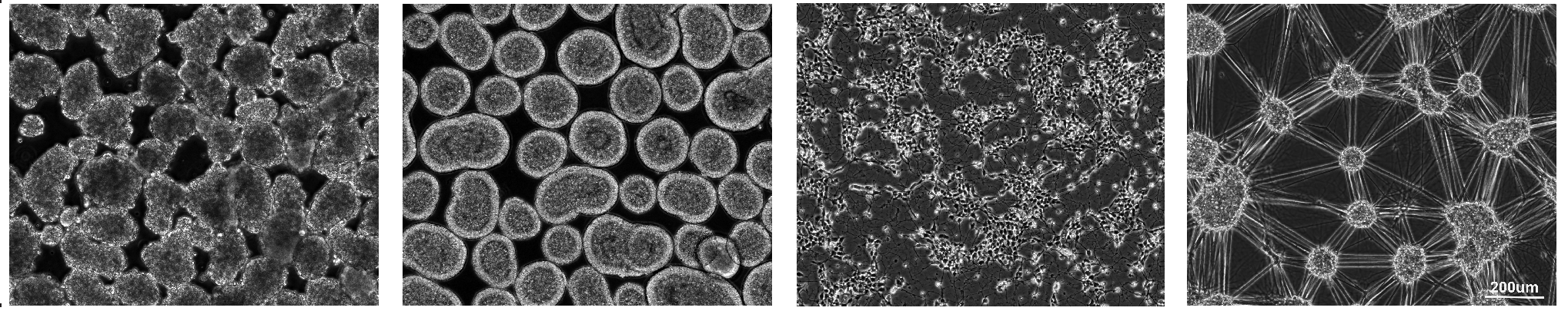 Motor neuron cells developed using our protocol at day 0, 7, 13, and 20 days (left to right).
