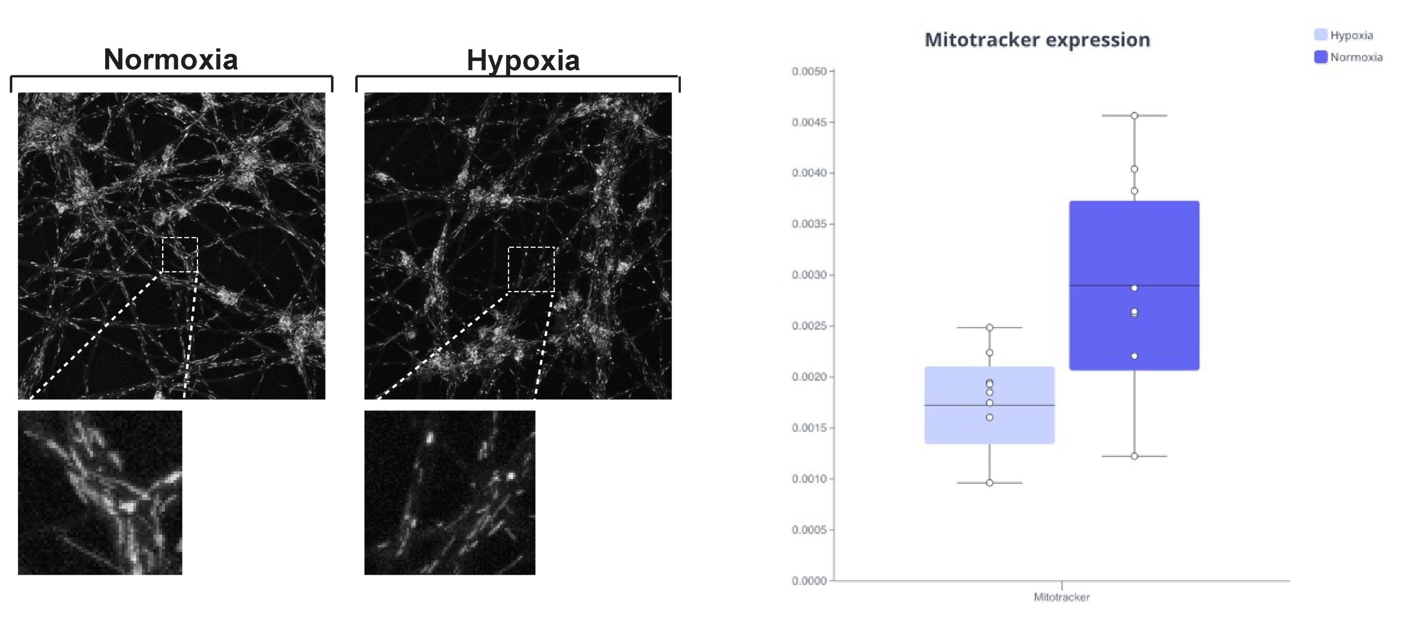 In the cell body, hypoxia induced expression of glycolytic pathway genes among others. This is important because it suggests that the cells switched from using oxidative phosphorylation (OXPHOS) pathway to produce energy to glycolysis which is much less efficient (2ATP are produced during glycolysis and 36 during OXPHOS). Additionally, mitochondrial translation genes were increased in the soma of hypoxic samples. Mitochondria is a critical cellular organelle responsible for generating most of the energy cells for survival and function, including using OXPHOS for energy production. Based on this observation we hypothesized that hypoxic cells have more mitochondria. To test this, we labeled mitochondria in live cells exposed to hypoxic conditions but interestingly found that they had significantly less mitochondria in their neurites than cells in normal oxygen levels (Pluto graph below). Therefore, these data suggest that hypoxia causes a loss of mitochondria in the neurites of motor neurons, which in turn triggers the soma to upregulate genes that encode the mitochondrial components in an attempt to make more mitochondria in response to the loss. The loss of mitochondria further explains the switch from OXPHOS to glycolysis we described above.